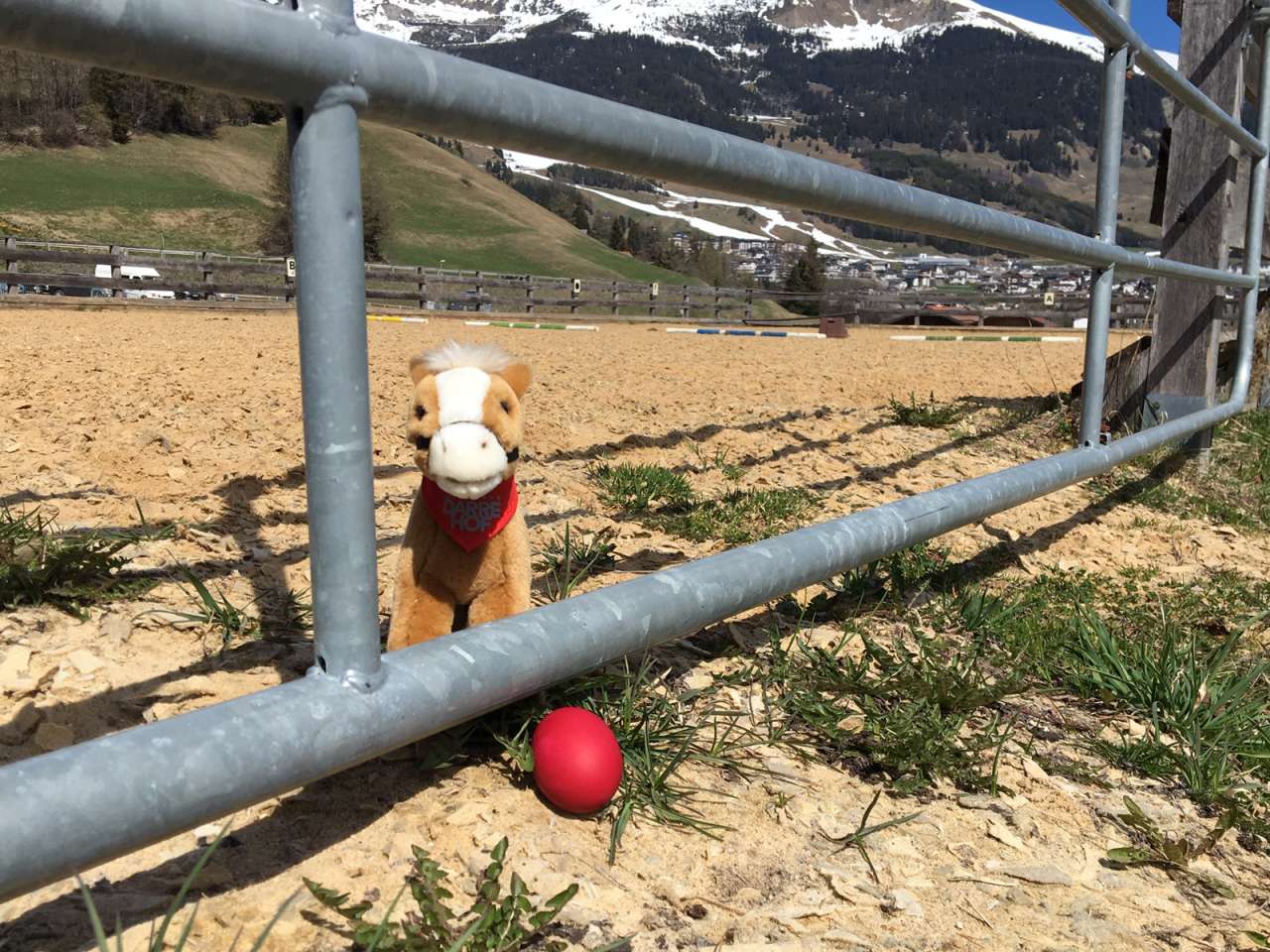 Okay, ich also schon morgens früh auf, damit ich auch ja im Hotel noch das lecker BIO-Frühstück schaffe, da weiß ich, dass ich sicherlich einen Schokohasen abbekomme, wenn ich auf dem Weg dahin schon keine finde! Ich raus aus dem Stall, im Schweinsgalopp ab um die Kurve und fall tatsächlich schon über das erste Osterei. „Wer hat das da verloren?“ dachte ich noch beim Einsammeln, und im Gedanken versunken bin ich dann gleich an der Ecke vom Reitplatz über das zweite gestolpert. „Das kann jetzt aber kein Zufall sein!“ … jetzt bin ich doch glatt neugierig geworden, da muss ja noch mehr davon sein! Zurück zum Reitstall und noch genau geschaut! Alles hab‘ ich abgesucht, die Ferienwohnung, den Pferdestall, beim Durchwühlen vom Sand in der Reithalle bin ich mir wie ein Trüffelschwein vorgekommen … nichts, rein gar nichts … was für eine Enttäuschung!