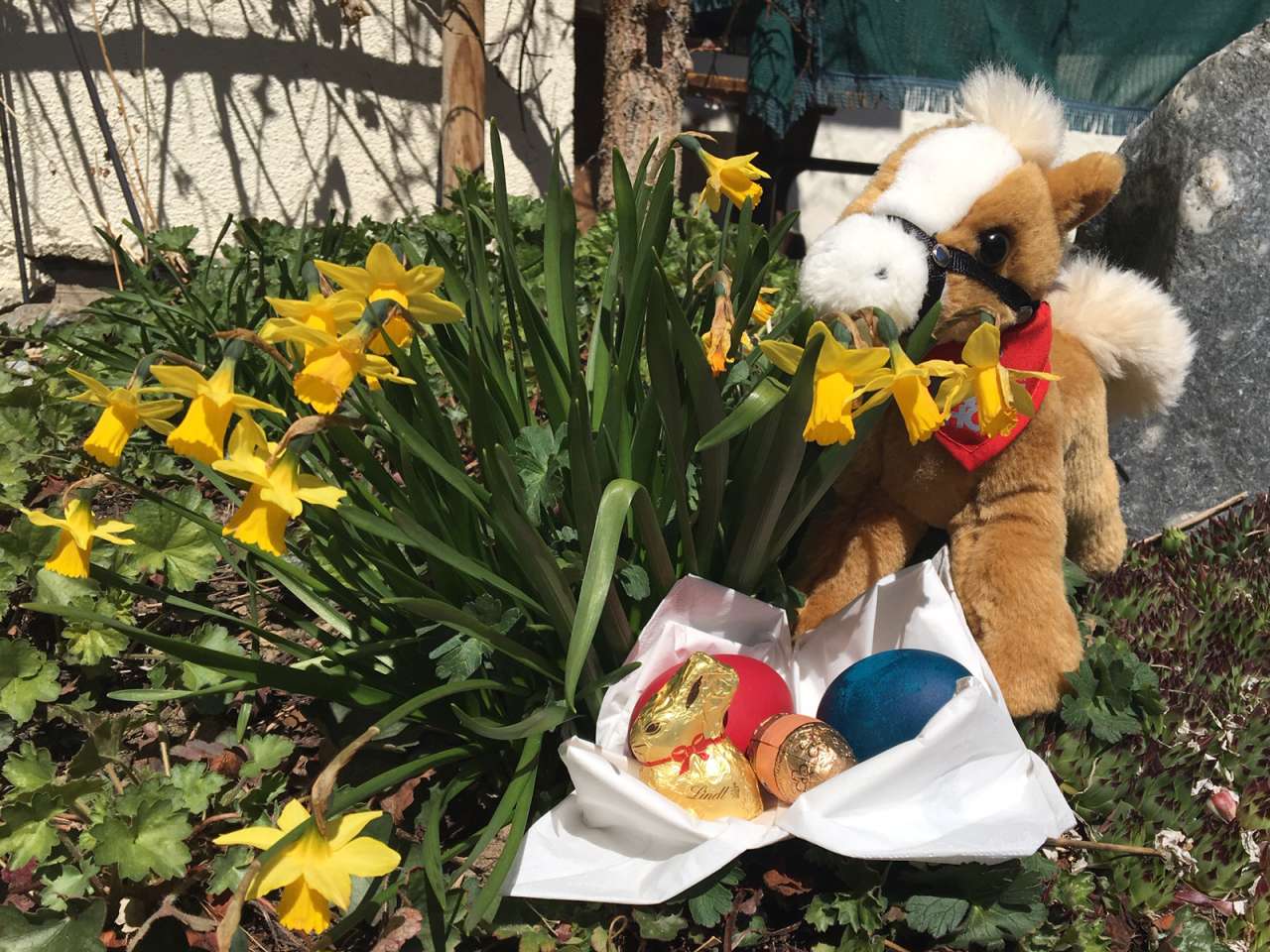 Müde und abgekämpft hab‘ ich mich zurück in meinen Stall geschleppt, da hat schon das gute Bergheu auf mich gewartet … ja, okay, Heu ist ja ganz in Ordnung, ist halt kein Schoko-Osterhase … mampf etwas verträumt mein Heu so dahin … und was war darunter versteckt … ein riesen Schokohase … oh du frohe Ostern!!!