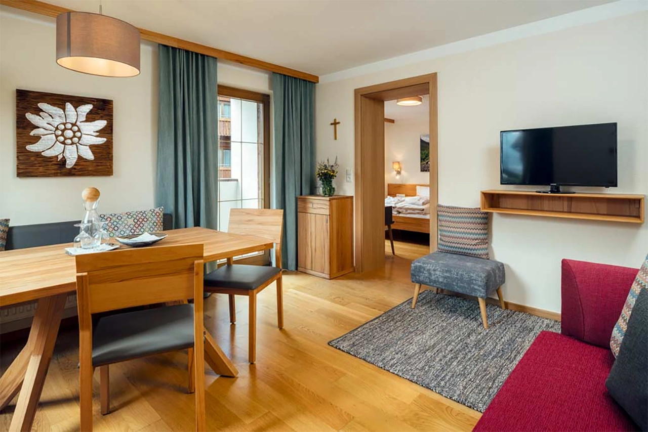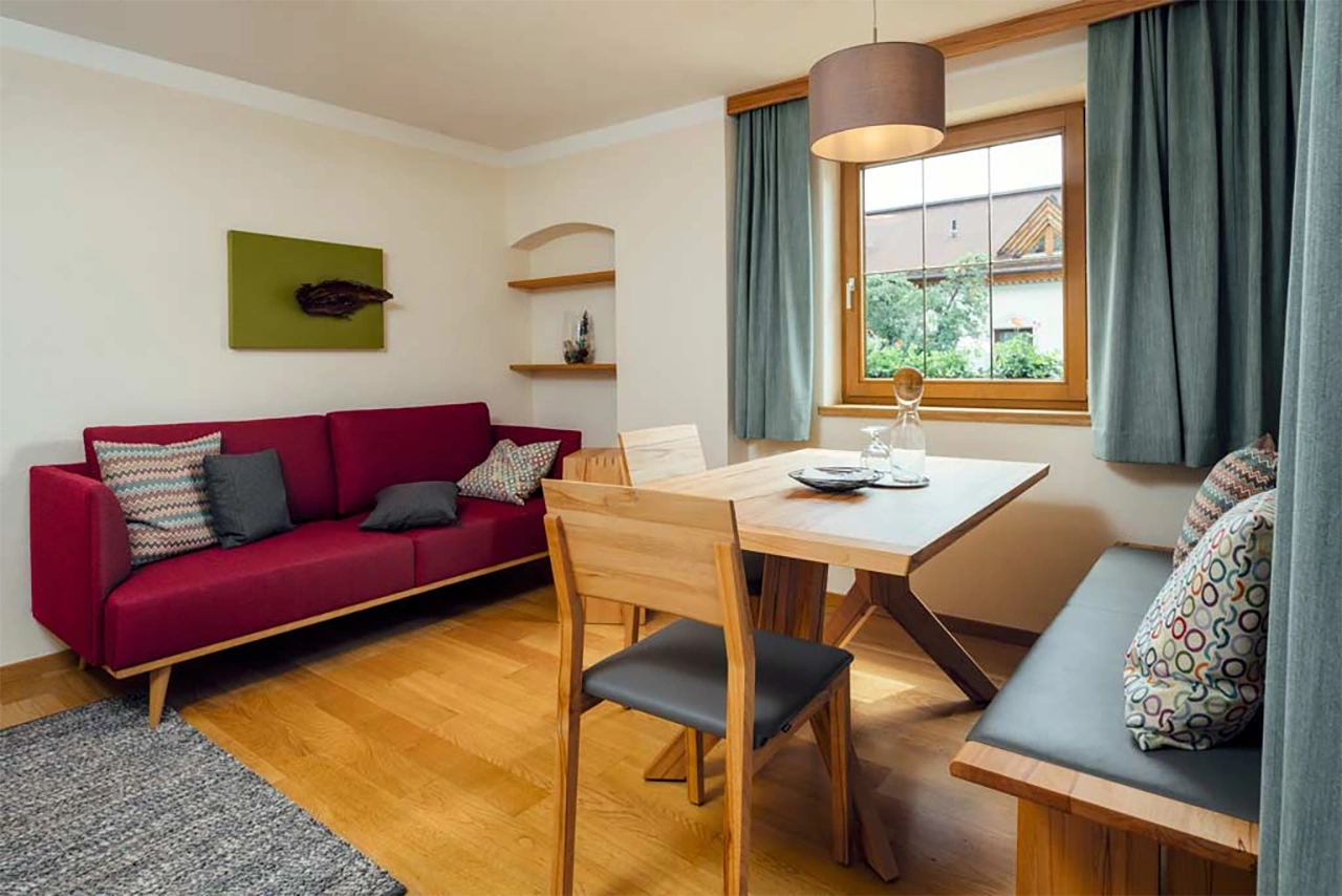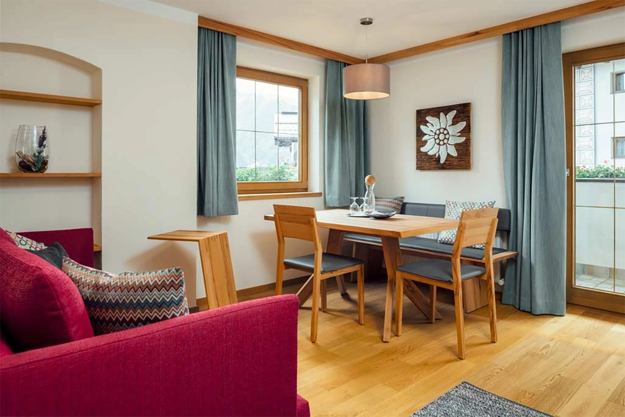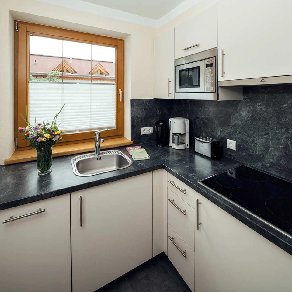 Unsere Ferienwohnung Huflattich mit Süd-Ostbalkon ist mit viel Liebe für 4 Personen eingerichtet mit 2 Doppelzimmern, einem Wohnbereich mit Essecke sowie einer separaten Küche.