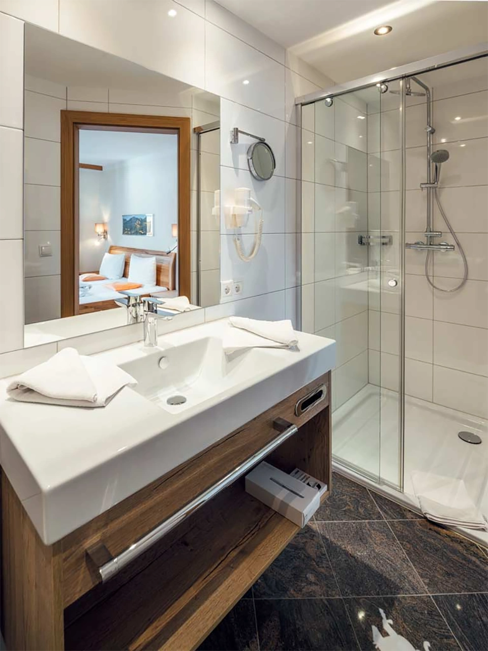 - 2 Badezimmer mit Dusche/WC, Haarföhn & Kosmetikspiegel