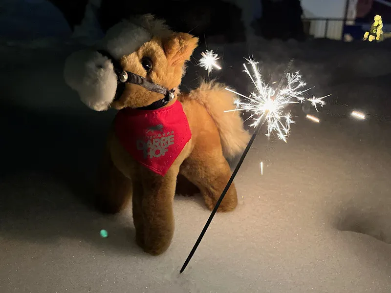 And just when it was at its very worst, the stable door opened and the light came on. Oh, that immediately made things feel a lot better; the flashes of colour in the night sky didn’t seem quite so bright and threatening anymore. Kind Christa came in … “Oh my darlings, are you scared! I’m so sorry, I actually overslept, I wanted to come much earlier. Thank goodness the fireworks woke me up. Come on, I’ve got something nice for you.” And she started shovelling the rest of the hay into our boxes … hmm, Christa didn’t seem stressed at all, and the hay smelled so wonderfully tempting … well then, maybe it wasn’t all that bad after all! Once the others also started munching the delicious hay, I calmed down too and enjoyed my tasty midnight snack. By the time we had finished the hay, all that banging outside had stopped.