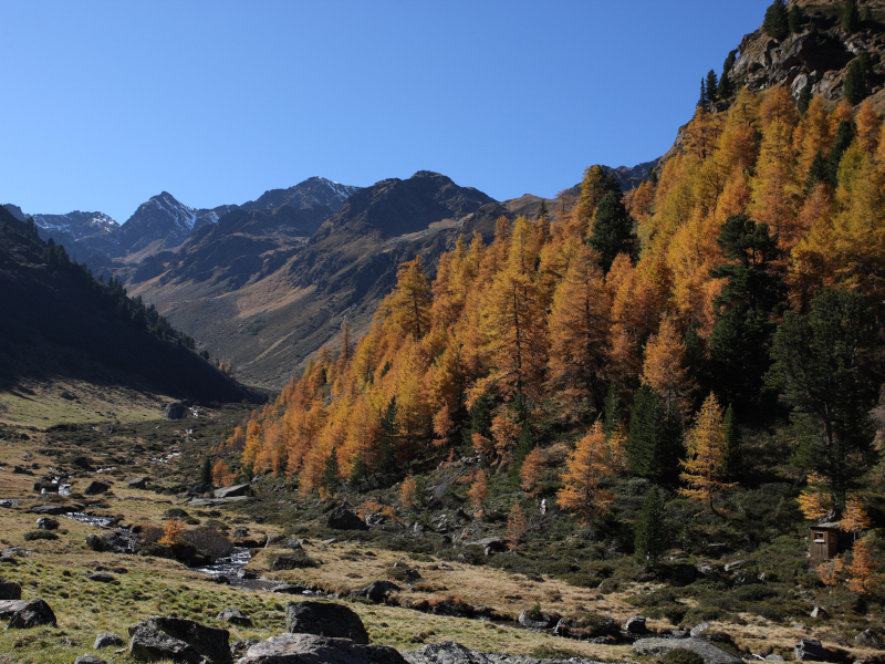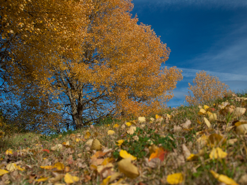 Okay, I’m bored anyway, so why not … At a small group of trees Andreas explains: “Look very carefully. Don’t you see that the reds in autumn are redder and the blues bluer than in summer? That’s because the sun’s rays have to travel further to reach the earth. The light has longer wavelengths, which makes the colours so much warmer and more intense. Isn’t it beautiful, Netti?!”