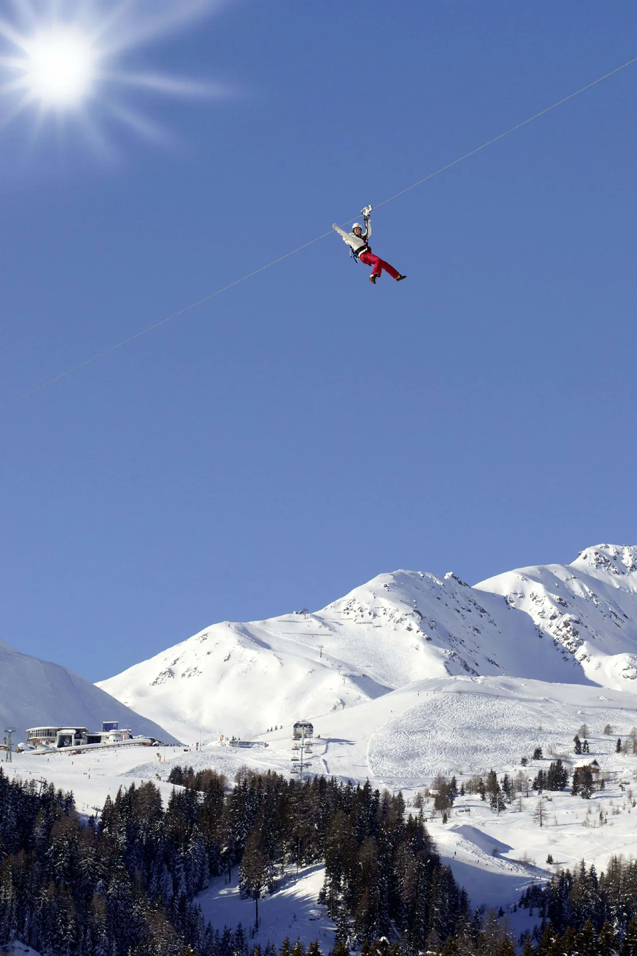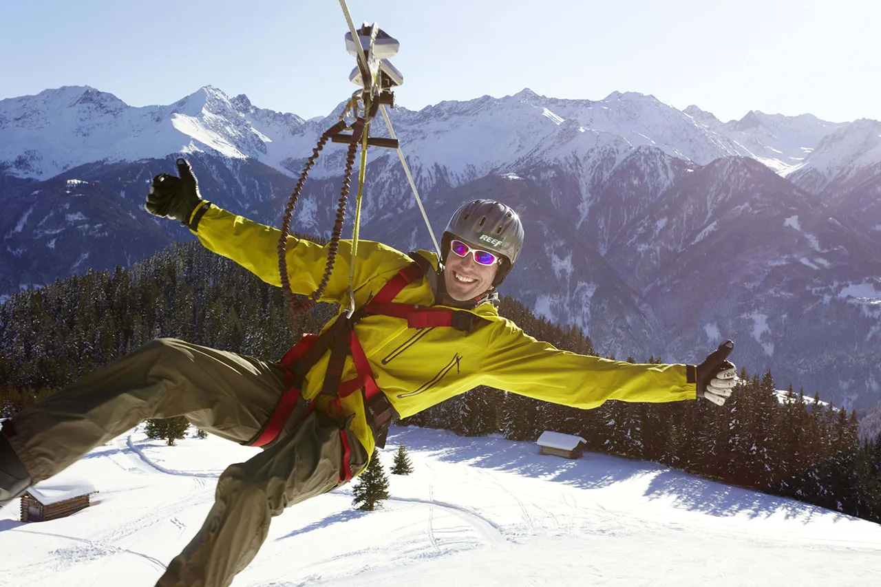 The Serfauser Sauser whisks you along 90 metres above the ground over a total distance of more than 2,000 metres, covering 400 metres in altitude at speeds of up to 65 km/h, gliding right above the heads of the skiers.
